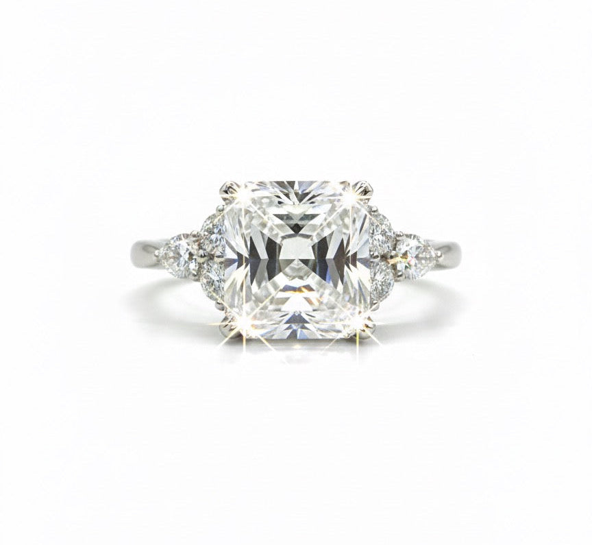 950 Platinum Asscher Cut Diamond With Round Brilliant And Marquees Diamond Shoulder Ring.